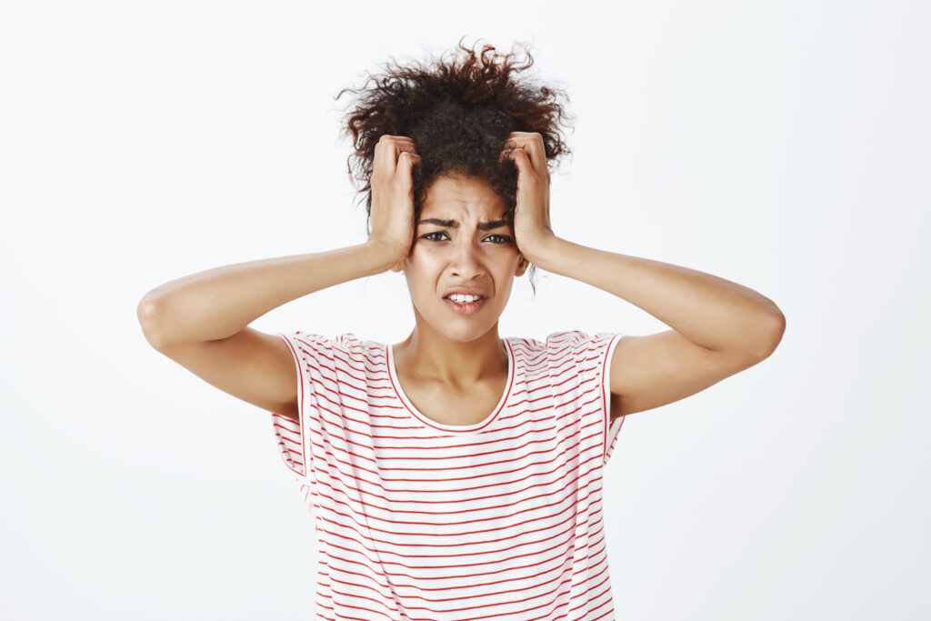 Intense displeased attractive woman in striped t-shirt, holding hands on head as if squeezing it, frowning from painful feeling or being desperate, having troubles or headache over gray wall.